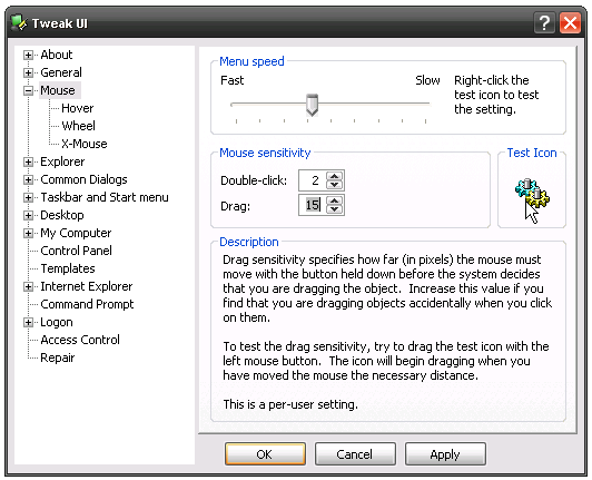 Si está ejecutando Windows XP, puede utilizar gratuito de Microsoft Tweak UI utilidad para configurar la configuración de arrastrar con facilidad. ¿Qué vamos a hacer es decirle a Windows que no asumen que estamos arrastrando hasta que hayamos mover más de 4 píxeles, lo que debería eliminar este problema, pero aún hacen arrastrar y soltar funciona bien para las operaciones normales.